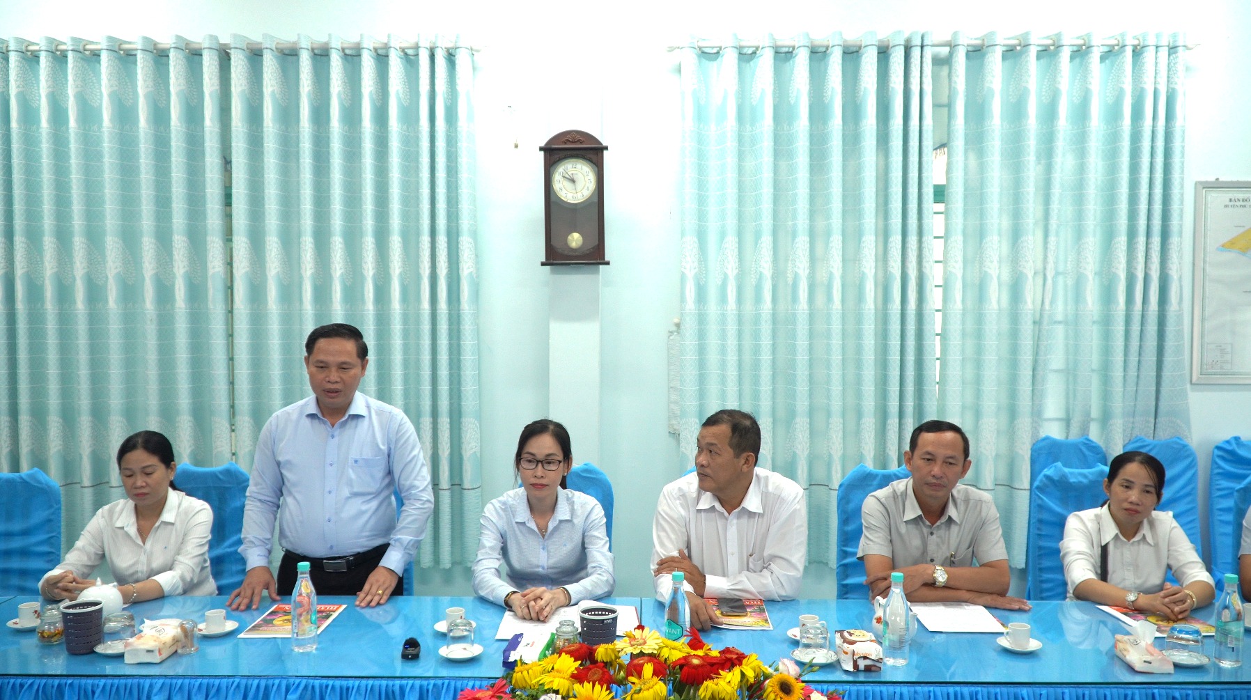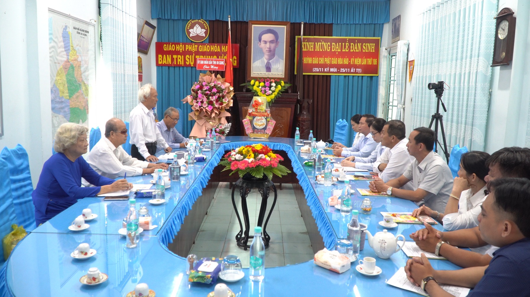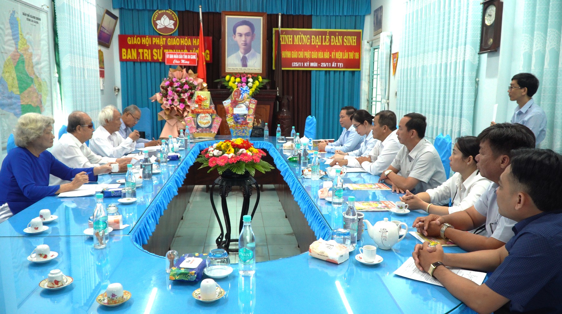 Ban Trị sự Trung ương đón tiếp đoàn công tác gồm có ông Nguyễn Tấn Đạt, Trưởng Ban Trị sự Trung ương Giáo hội Phật giáo Hòa Hảo; ông Lê Ngọc Lợi, Phó Trưởng Ban Trị sự Trung ương, Trưởng Ban Từ thiện xã hội; ông Nguyễn Văn Lượng, Phó Trưởng Ban Trị sự Trung ương, Trưởng Ban Tổ chức – Nhân sự; bà Diêu Huệ Nương, Ủy viên Ban Thường trực, Phó Trưởng Ban Tài chính.